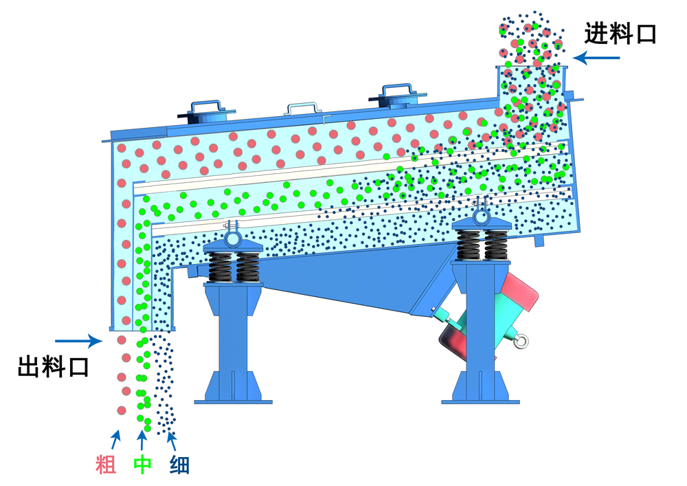 亮粉分级夜色直播APP盒子下载以振动电机产生的激振力为动力,核心通过振动传递和多层筛网分离来实现分级。运行时,振动电机带动筛箱直线往复振动,使亮粉随振动向前运动,而从上到下孔径递减的多层筛网会对亮粉按颗粒大小分离:大颗粒的亮粉无法通过上层筛网,排出为粗级产物;中等颗粒通过上层筛网后被中层筛网截留,成为中级产物;小颗粒穿透所有筛网,形成细级产物,最终完成亮粉分级。